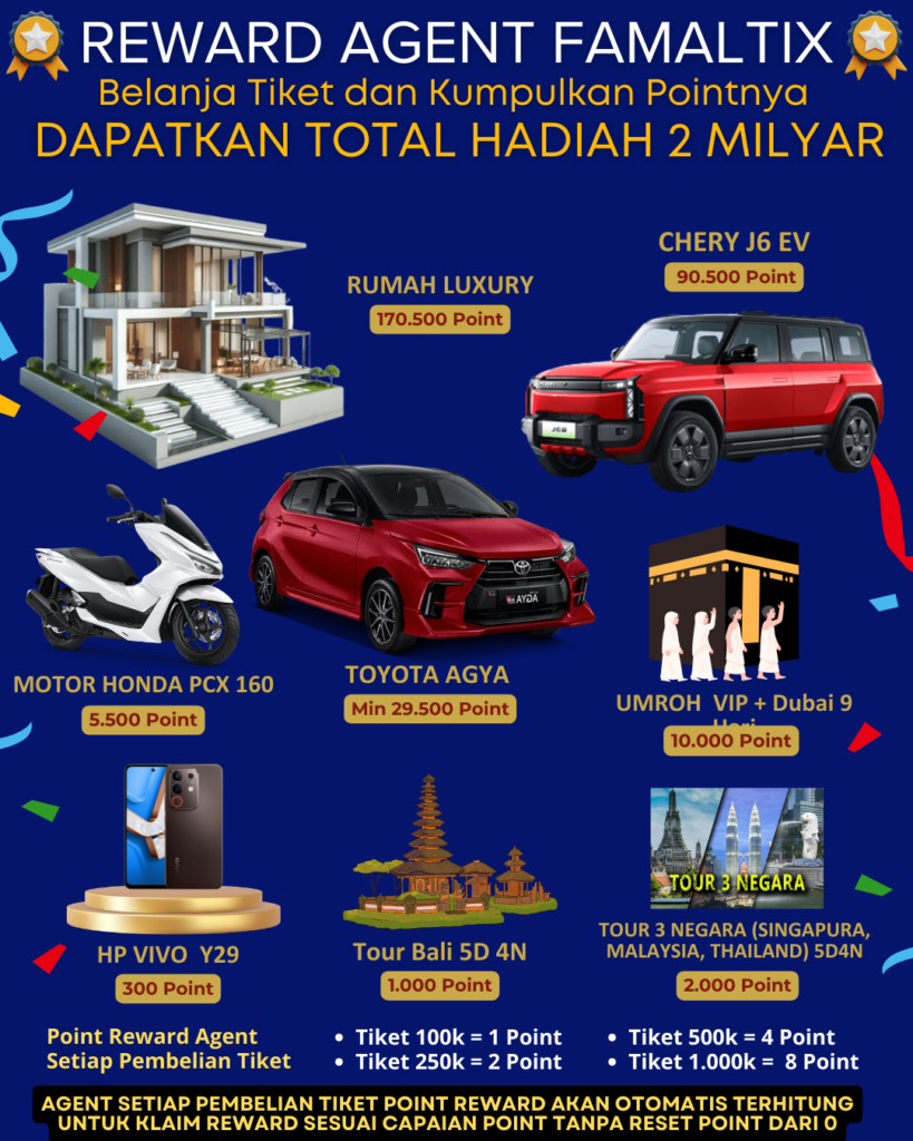 Famaltix akan mengadakan undian berhadiah senilai Ratusan Juta Rupiah untuk calon member yang sudah melakukan transaksi melalui bizclasspreneur.com , Hadiahnya Berubah Sepeda Motor Listrik, Voucher Belanja Senilai 500rb, Iphone 13 pro dan Emas Antam 2 gram, Bisa Kumpulkan Hadiah Melalui Tiket Investor Saham Halal